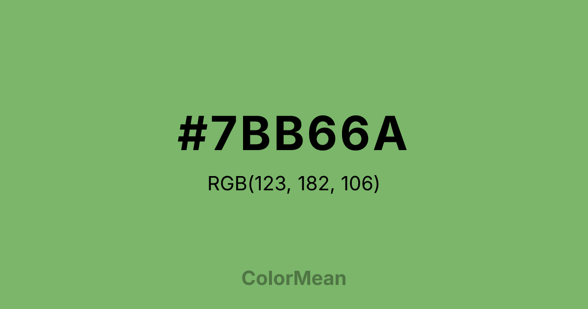#7BB66A RGB value is (123, 182, 106). The hex color red value is 123, green is 182, and blue is 106. Its HSL format shows a hue of 107°, saturation of 34 percent, and lightness of 56 percent. The CMYK process values are 32 percent, 0 percent, 42 percent, 29 percent.