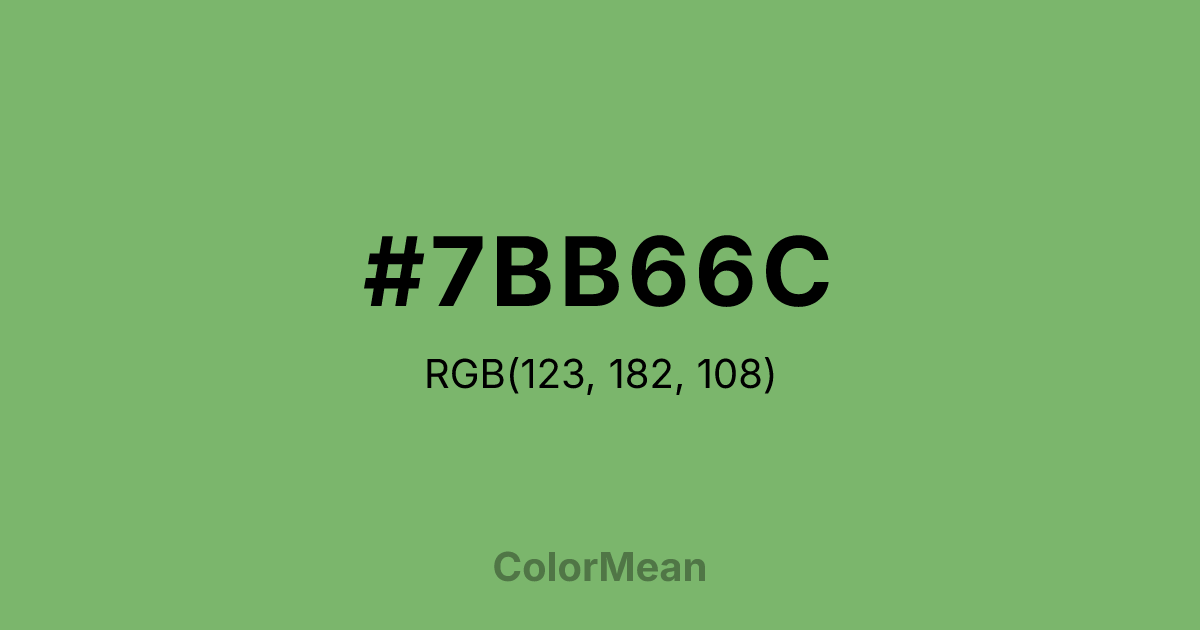 #7BB66C RGB value is (123, 182, 108). The hex color red value is 123, green is 182, and blue is 108. Its HSL format shows a hue of 108°, saturation of 34 percent, and lightness of 57 percent. The CMYK process values are 32 percent, 0 percent, 41 percent, 29 percent.