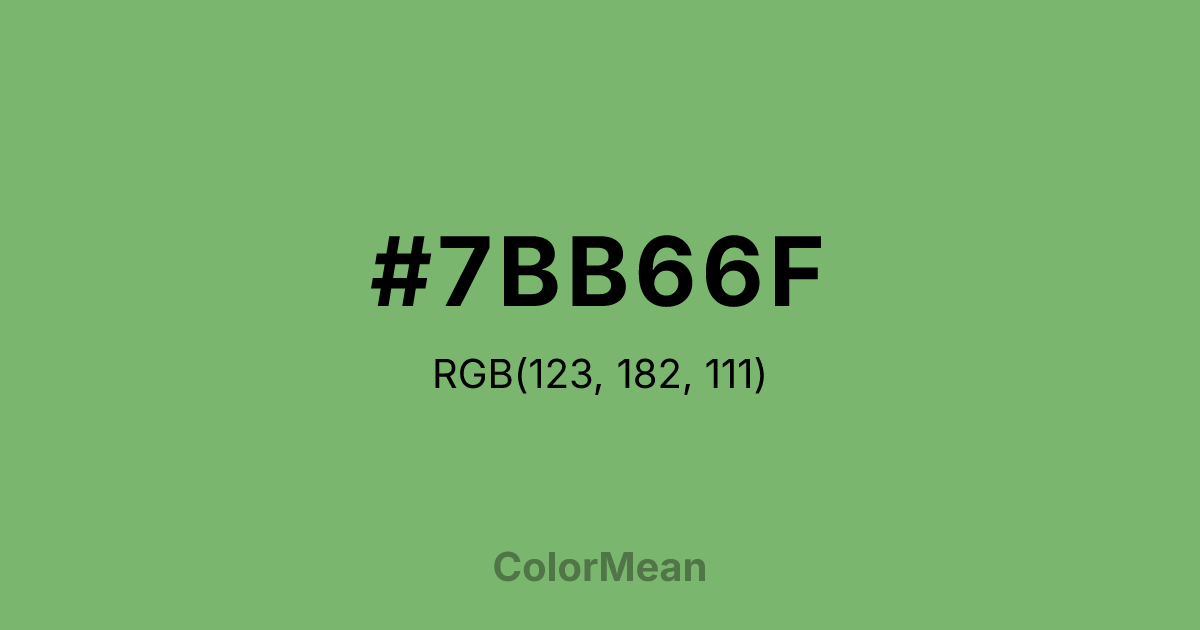 #7BB66F RGB value is (123, 182, 111). The hex color red value is 123, green is 182, and blue is 111. Its HSL format shows a hue of 110°, saturation of 33 percent, and lightness of 57 percent. The CMYK process values are 32 percent, 0 percent, 39 percent, 29 percent.