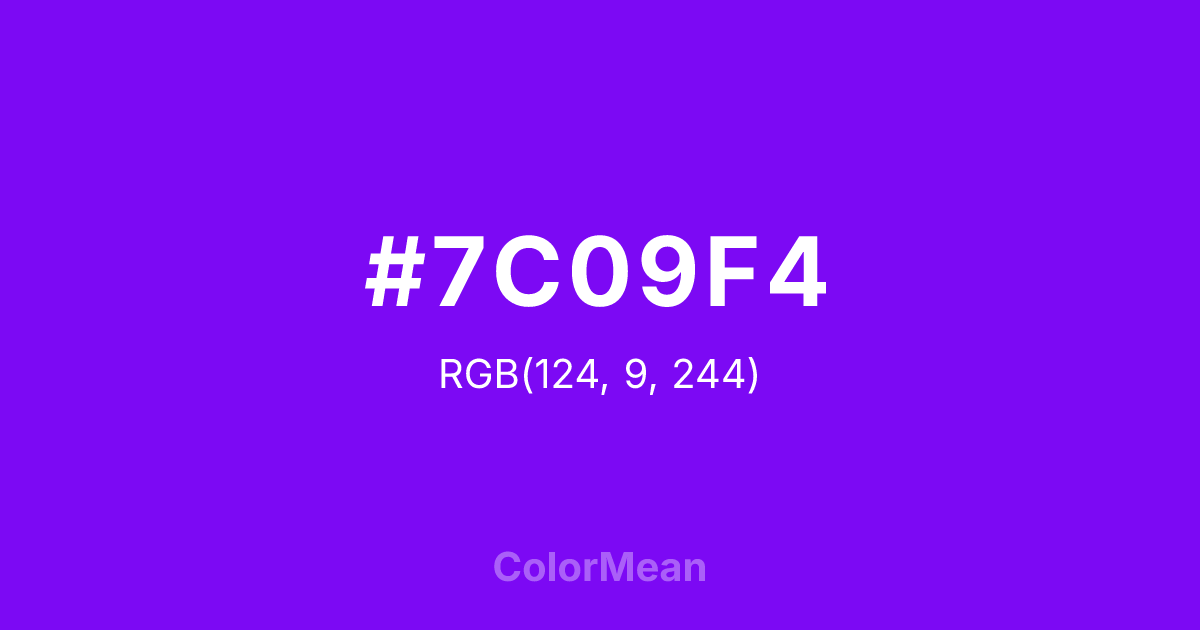 #7C09F4 RGB value is (124, 9, 244). The hex color red value is 124, green is 9, and blue is 244. Its HSL format shows a hue of 269°, saturation of 93 percent, and lightness of 50 percent. The CMYK process values are 49 percent, 96 percent, 0 percent, 4 percent.