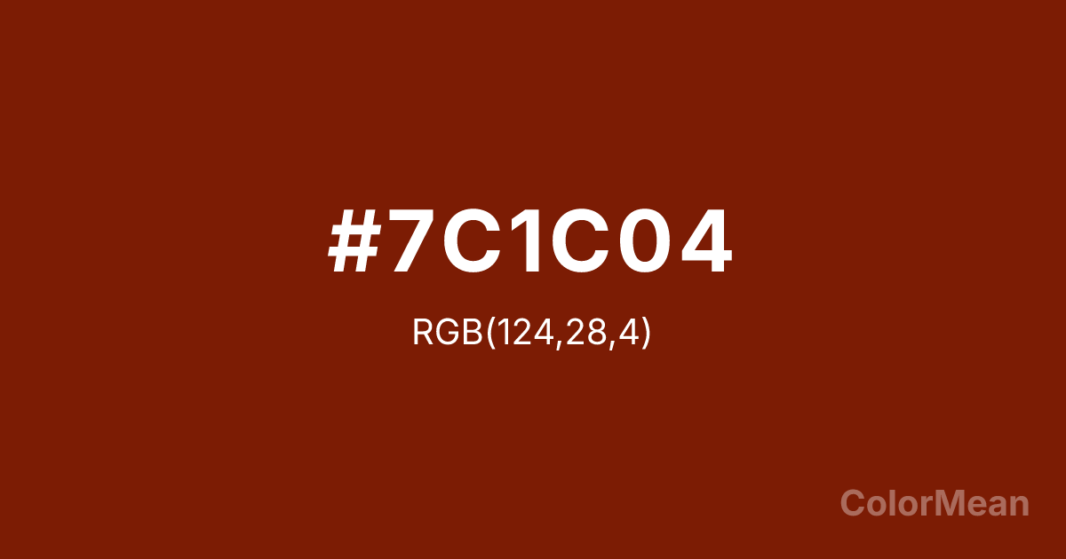 #7C1C04 RGB value is (124, 28, 4). The hex color red value is 124, green is 28, and blue is 4. Its HSL format shows a hue of 12°, saturation of 94 percent, and lightness of 25 percent. The CMYK process values are 0 percent, 77 percent, 97 percent, 51 percent.
