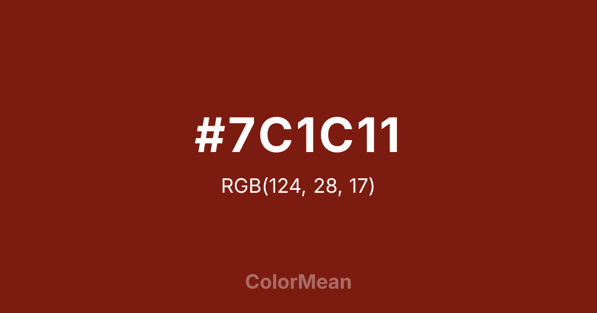 #7C1C11 RGB value is (124, 28, 17). The hex color red value is 124, green is 28, and blue is 17. Its HSL format shows a hue of 6°, saturation of 76 percent, and lightness of 28 percent. The CMYK process values are 0 percent, 77 percent, 86 percent, 51 percent.