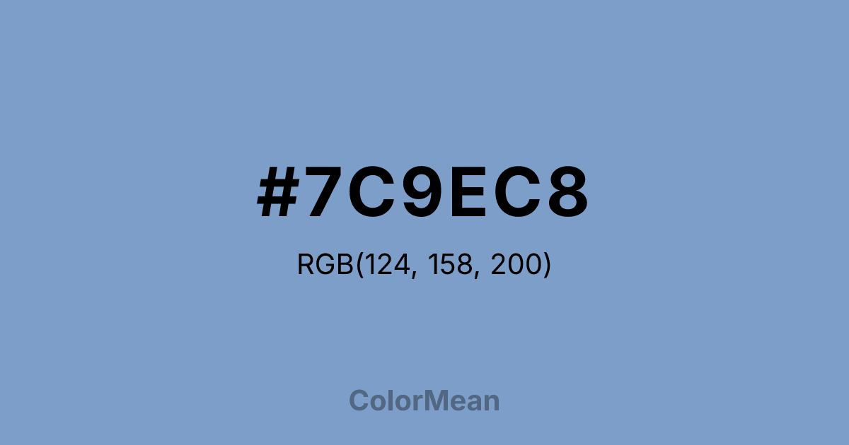 #7C9EC8 RGB value is (124, 158, 200). The hex color red value is 124, green is 158, and blue is 200. Its HSL format shows a hue of 213°, saturation of 41 percent, and lightness of 64 percent. The CMYK process values are 38 percent, 21 percent, 0 percent, 22 percent.