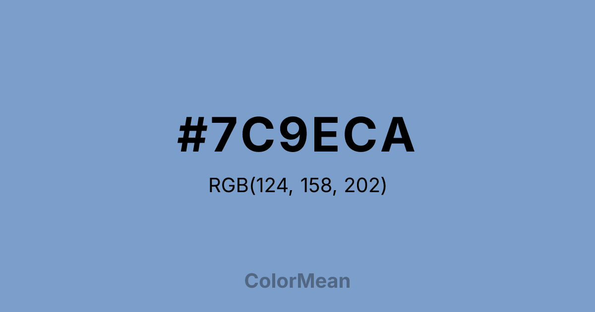 #7C9ECA RGB value is (124, 158, 202). The hex color red value is 124, green is 158, and blue is 202. Its HSL format shows a hue of 214°, saturation of 42 percent, and lightness of 64 percent. The CMYK process values are 39 percent, 22 percent, 0 percent, 21 percent.