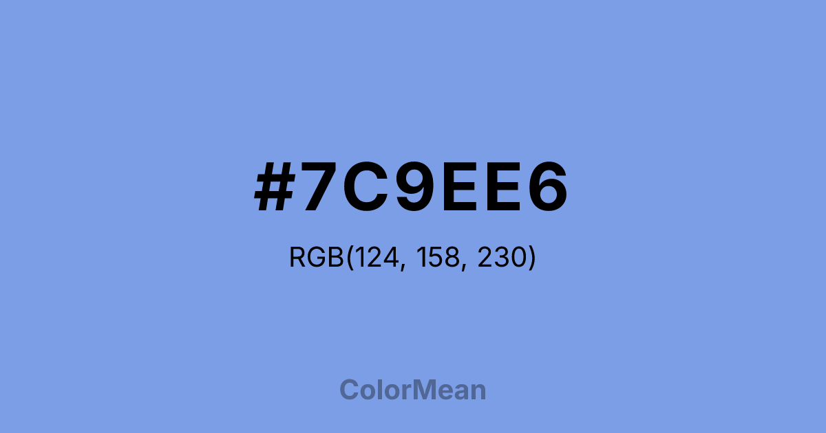 #7C9EE6 RGB value is (124, 158, 230). The hex color red value is 124, green is 158, and blue is 230. Its HSL format shows a hue of 221°, saturation of 68 percent, and lightness of 69 percent. The CMYK process values are 46 percent, 31 percent, 0 percent, 10 percent.