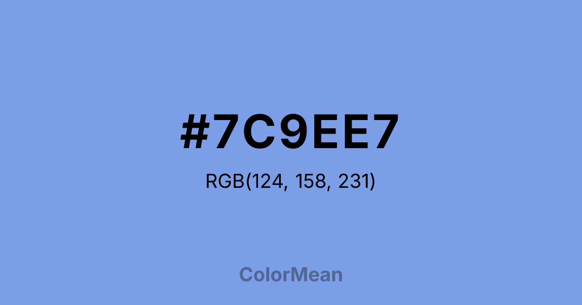 #7C9EE7 RGB value is (124, 158, 231). The hex color red value is 124, green is 158, and blue is 231. Its HSL format shows a hue of 221°, saturation of 69 percent, and lightness of 70 percent. The CMYK process values are 46 percent, 32 percent, 0 percent, 9 percent.