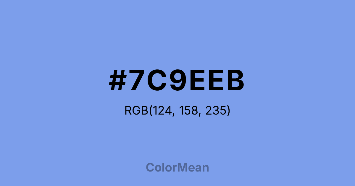 #7C9EEB RGB value is (124, 158, 235). The hex color red value is 124, green is 158, and blue is 235. Its HSL format shows a hue of 222°, saturation of 74 percent, and lightness of 70 percent. The CMYK process values are 47 percent, 33 percent, 0 percent, 8 percent.