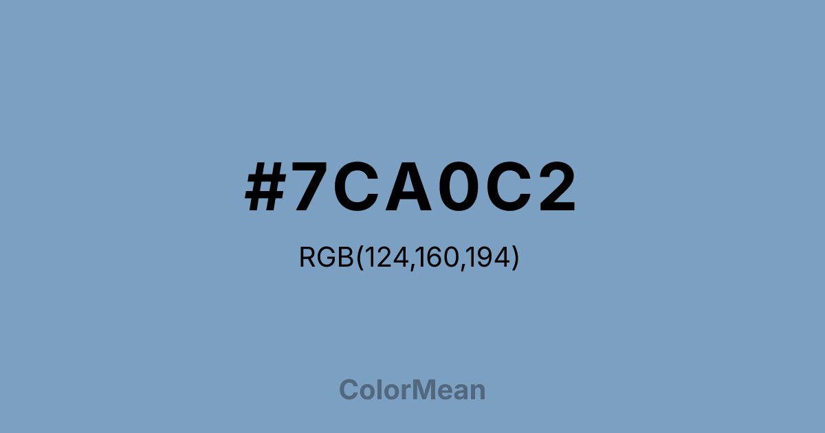 #7CA0C2 RGB value is (124, 160, 194). The hex color red value is 124, green is 160, and blue is 194. Its HSL format shows a hue of 209°, saturation of 36 percent, and lightness of 62 percent. The CMYK process values are 36 percent, 18 percent, 0 percent, 24 percent.