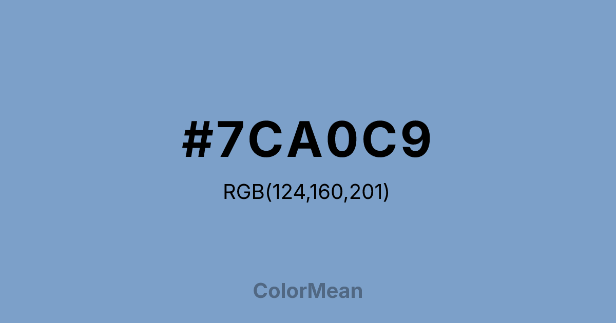 #7CA0C9 RGB value is (124, 160, 201). The hex color red value is 124, green is 160, and blue is 201. Its HSL format shows a hue of 212°, saturation of 42 percent, and lightness of 64 percent. The CMYK process values are 38 percent, 20 percent, 0 percent, 21 percent.