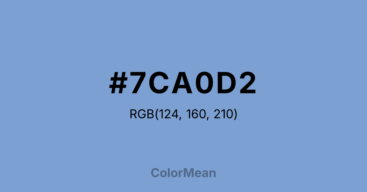 #7CA0D2 RGB value is (124, 160, 210). The hex color red value is 124, green is 160, and blue is 210. Its HSL format shows a hue of 215°, saturation of 49 percent, and lightness of 65 percent. The CMYK process values are 41 percent, 24 percent, 0 percent, 18 percent.