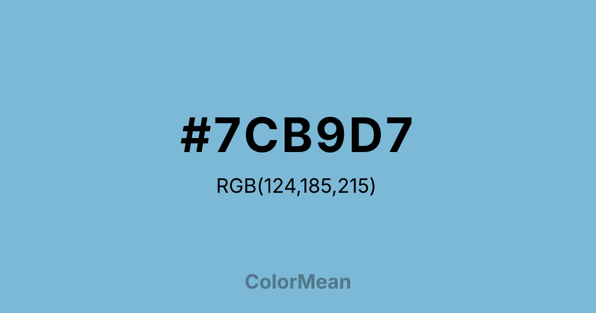 #7CB9D7 RGB value is (124, 185, 215). The hex color red value is 124, green is 185, and blue is 215. Its HSL format shows a hue of 200°, saturation of 53 percent, and lightness of 66 percent. The CMYK process values are 42 percent, 14 percent, 0 percent, 16 percent.