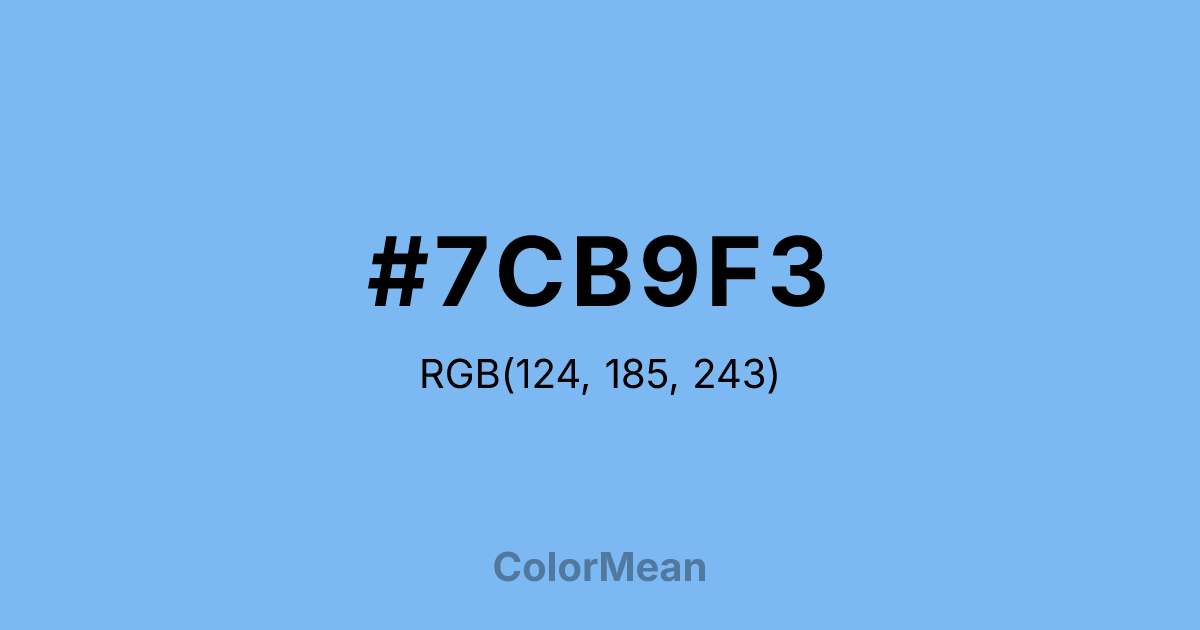 #7CB9F3 RGB value is (124, 185, 243). The hex color red value is 124, green is 185, and blue is 243. Its HSL format shows a hue of 209°, saturation of 83 percent, and lightness of 72 percent. The CMYK process values are 49 percent, 24 percent, 0 percent, 5 percent.