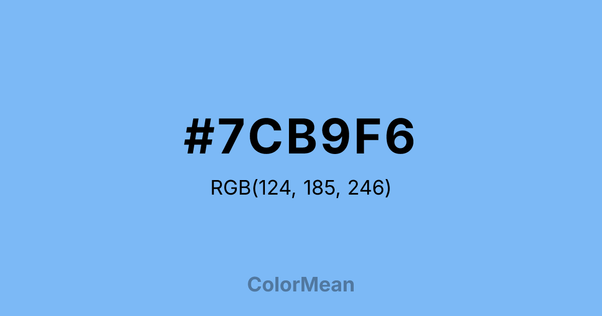 #7CB9F6 RGB value is (124, 185, 246). The hex color red value is 124, green is 185, and blue is 246. Its HSL format shows a hue of 210°, saturation of 87 percent, and lightness of 73 percent. The CMYK process values are 50 percent, 25 percent, 0 percent, 4 percent.