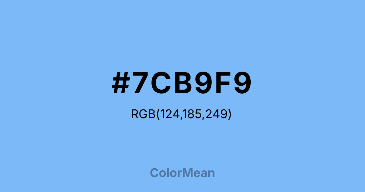 #7CB9F9 RGB value is (124, 185, 249). The hex color red value is 124, green is 185, and blue is 249. Its HSL format shows a hue of 211°, saturation of 91 percent, and lightness of 73 percent. The CMYK process values are 50 percent, 26 percent, 0 percent, 2 percent.