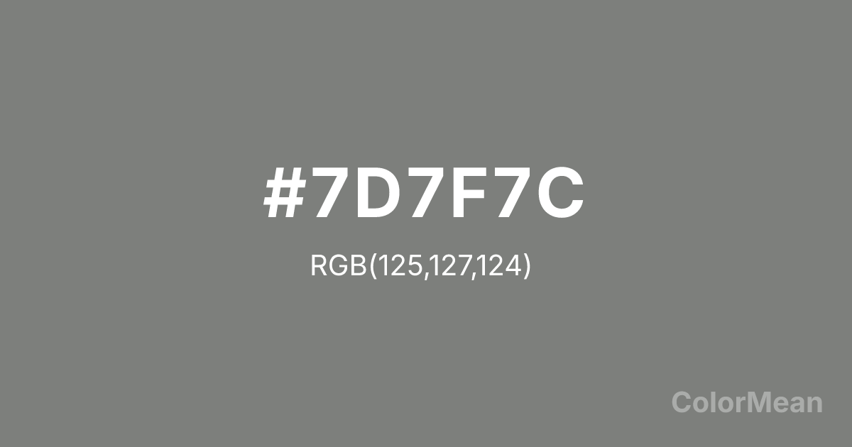 #7D7F7C RGB value is (125, 127, 124). The hex color red value is 125, green is 127, and blue is 124. Its HSL format shows a hue of 100°, saturation of 1 percent, and lightness of 49 percent. The CMYK process values are 2 percent, 0 percent, 2 percent, 50 percent.