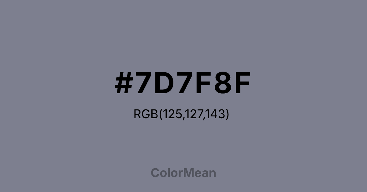 #7D7F8F RGB value is (125, 127, 143). The hex color red value is 125, green is 127, and blue is 143. Its HSL format shows a hue of 233°, saturation of 7 percent, and lightness of 53 percent. The CMYK process values are 13 percent, 11 percent, 0 percent, 44 percent.