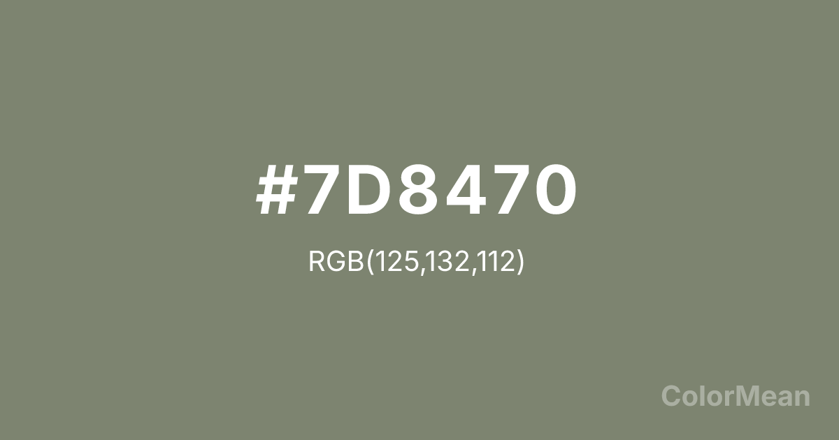 #7D8470 RGB value is (125, 132, 112). The hex color red value is 125, green is 132, and blue is 112. Its HSL format shows a hue of 81°, saturation of 8 percent, and lightness of 48 percent. The CMYK process values are 5 percent, 0 percent, 15 percent, 48 percent.