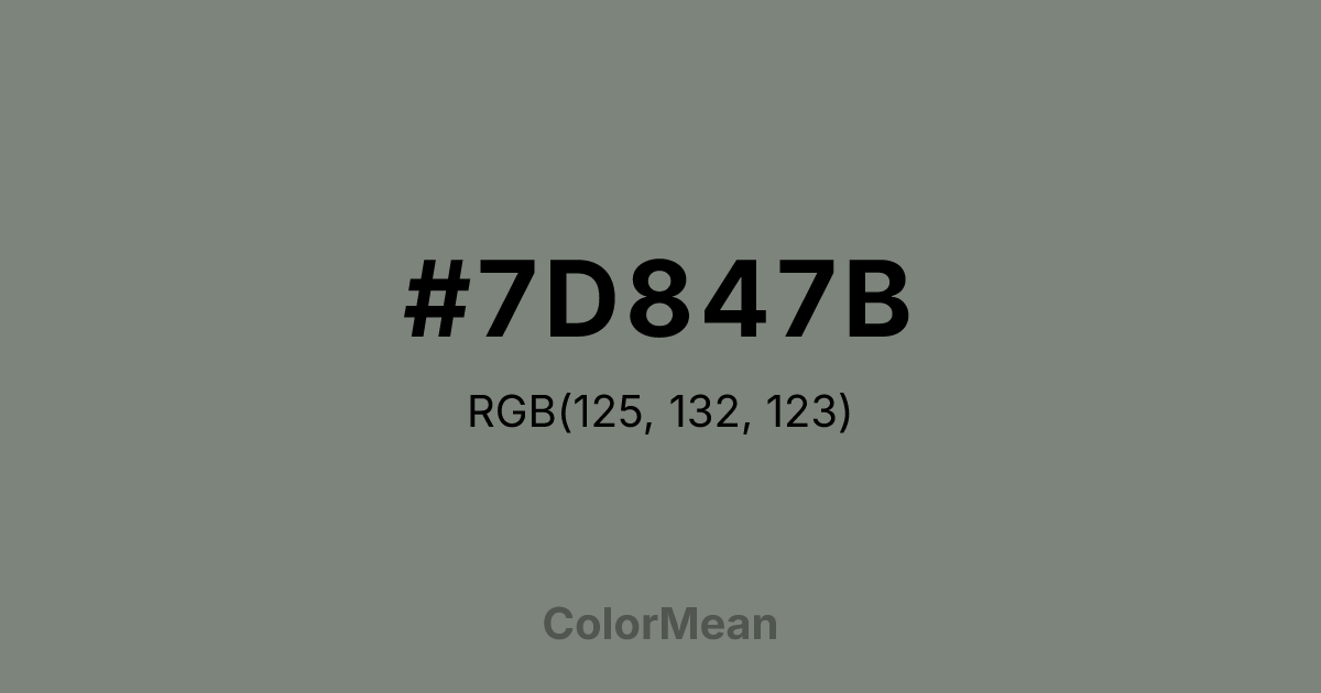 #7D847B RGB value is (125, 132, 123). The hex color red value is 125, green is 132, and blue is 123. Its HSL format shows a hue of 107°, saturation of 4 percent, and lightness of 50 percent. The CMYK process values are 5 percent, 0 percent, 7 percent, 48 percent.