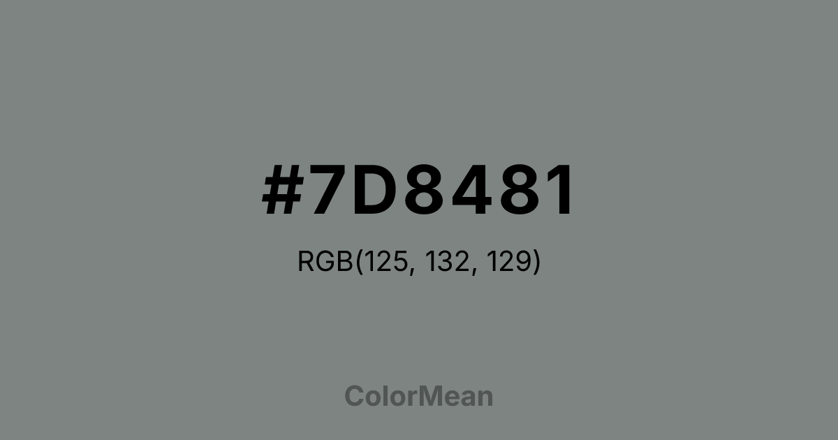 #7D8481 RGB value is (125, 132, 129). The hex color red value is 125, green is 132, and blue is 129. Its HSL format shows a hue of 154°, saturation of 3 percent, and lightness of 50 percent. The CMYK process values are 5 percent, 0 percent, 2 percent, 48 percent.