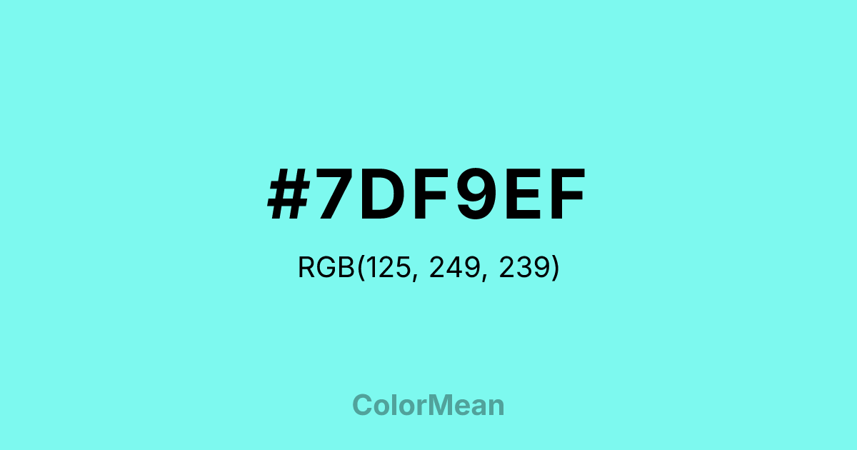 #7DF9EF RGB value is (125, 249, 239). The hex color red value is 125, green is 249, and blue is 239. Its HSL format shows a hue of 175°, saturation of 91 percent, and lightness of 73 percent. The CMYK process values are 50 percent, 0 percent, 4 percent, 2 percent.