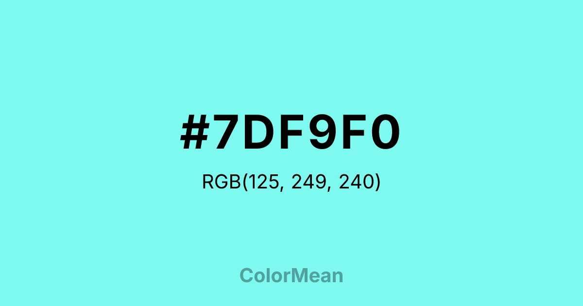 #7DF9F0 RGB value is (125, 249, 240). The hex color red value is 125, green is 249, and blue is 240. Its HSL format shows a hue of 176°, saturation of 91 percent, and lightness of 73 percent. The CMYK process values are 50 percent, 0 percent, 4 percent, 2 percent.