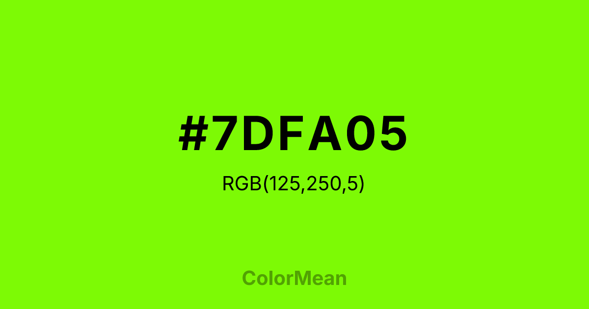 #7DFA05 RGB value is (125, 250, 5). The hex color red value is 125, green is 250, and blue is 5. Its HSL format shows a hue of 91°, saturation of 96 percent, and lightness of 50 percent. The CMYK process values are 50 percent, 0 percent, 98 percent, 2 percent.