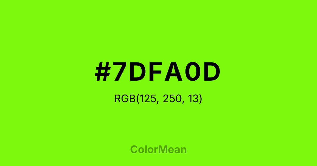 #7DFA0D RGB value is (125, 250, 13). The hex color red value is 125, green is 250, and blue is 13. Its HSL format shows a hue of 92°, saturation of 96 percent, and lightness of 52 percent. The CMYK process values are 50 percent, 0 percent, 95 percent, 2 percent.