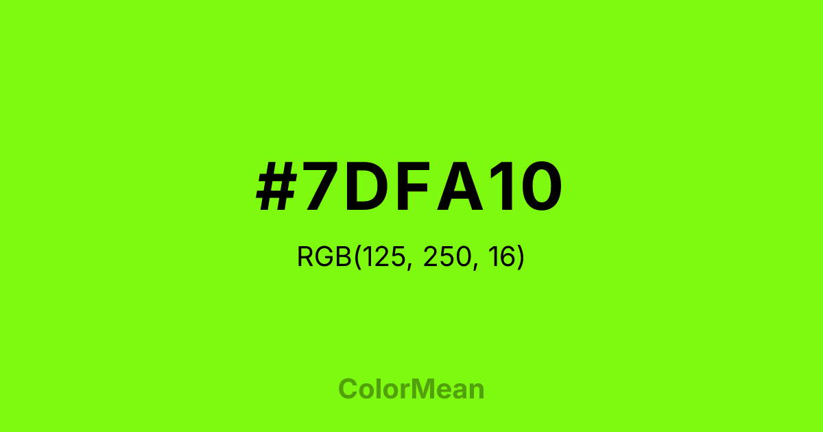 #7DFA10 RGB value is (125, 250, 16). The hex color red value is 125, green is 250, and blue is 16. Its HSL format shows a hue of 92°, saturation of 96 percent, and lightness of 52 percent. The CMYK process values are 50 percent, 0 percent, 94 percent, 2 percent.