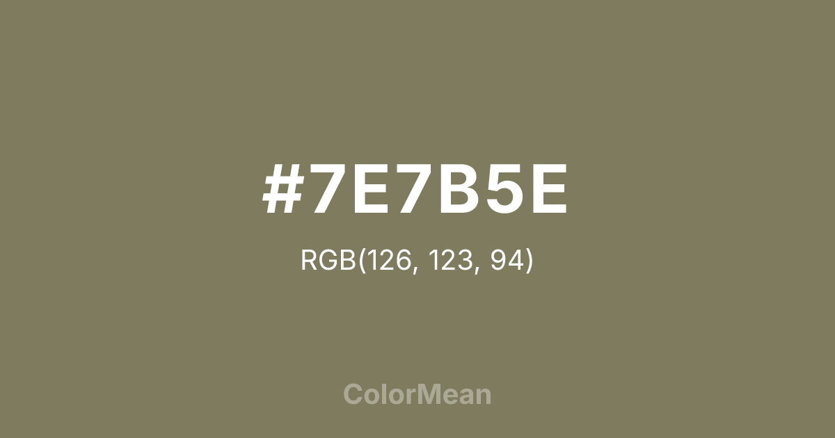 #7E7B5E RGB value is (126, 123, 94). The hex color red value is 126, green is 123, and blue is 94. Its HSL format shows a hue of 54°, saturation of 15 percent, and lightness of 43 percent. The CMYK process values are 0 percent, 2 percent, 25 percent, 51 percent.