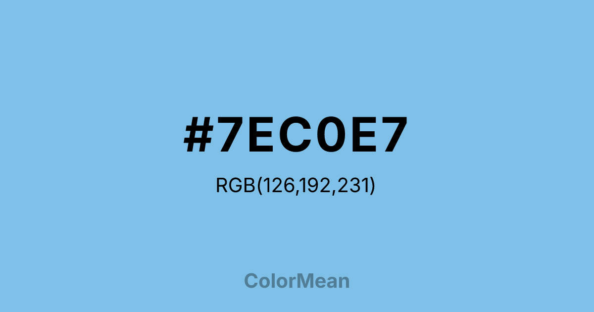 #7EC0E7 RGB value is (126, 192, 231). The hex color red value is 126, green is 192, and blue is 231. Its HSL format shows a hue of 202°, saturation of 69 percent, and lightness of 70 percent. The CMYK process values are 45 percent, 17 percent, 0 percent, 9 percent.