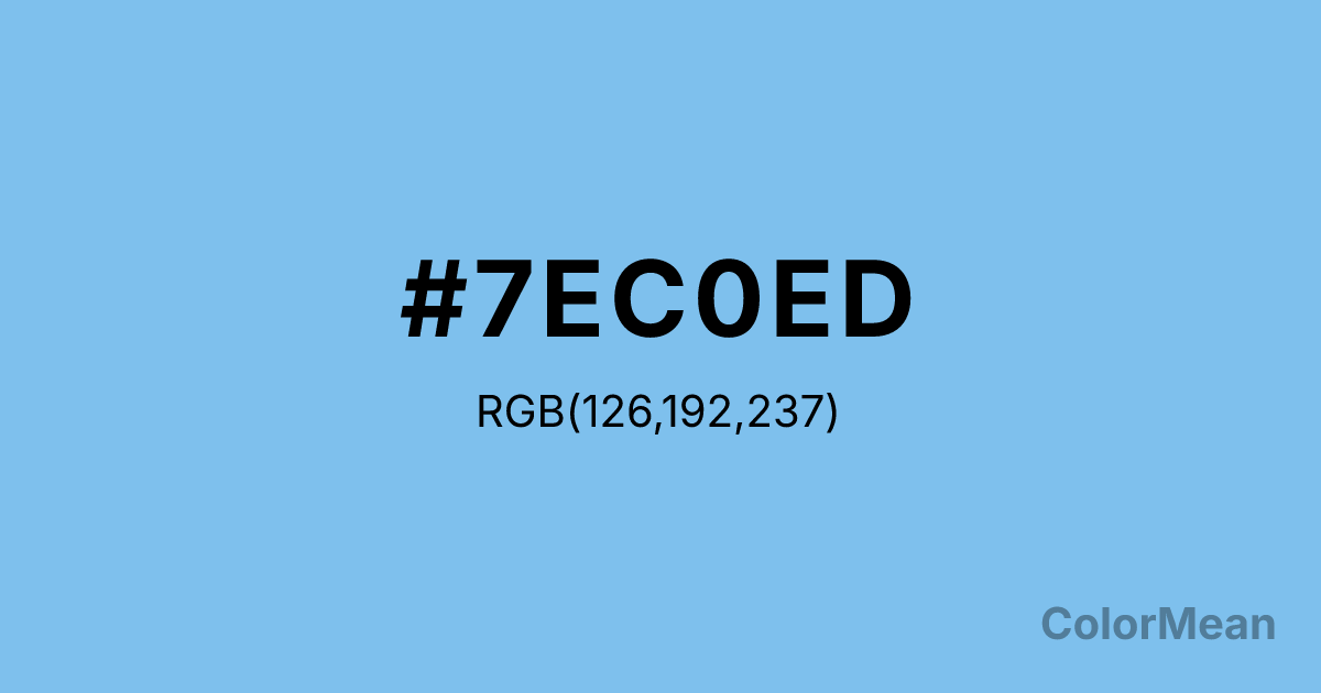 #7EC0ED RGB value is (126, 192, 237). The hex color red value is 126, green is 192, and blue is 237. Its HSL format shows a hue of 204°, saturation of 76 percent, and lightness of 71 percent. The CMYK process values are 47 percent, 19 percent, 0 percent, 7 percent.