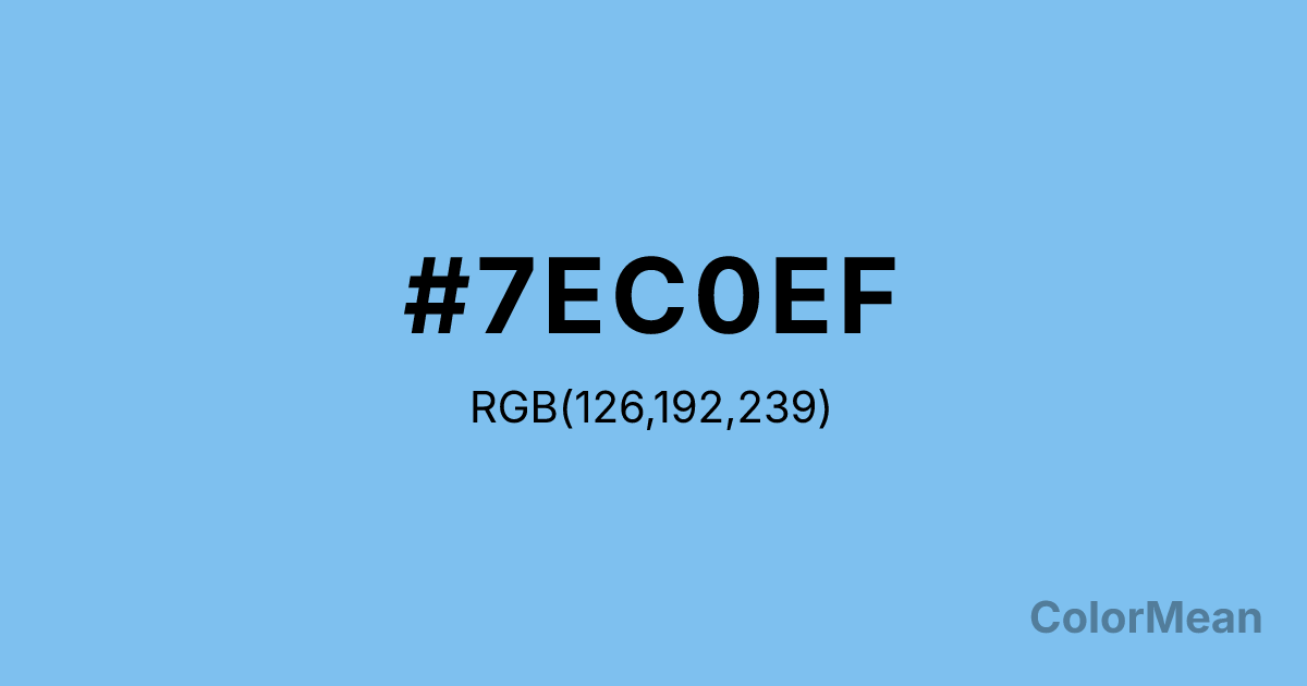 #7EC0EF RGB value is (126, 192, 239). The hex color red value is 126, green is 192, and blue is 239. Its HSL format shows a hue of 205°, saturation of 78 percent, and lightness of 72 percent. The CMYK process values are 47 percent, 20 percent, 0 percent, 6 percent.
