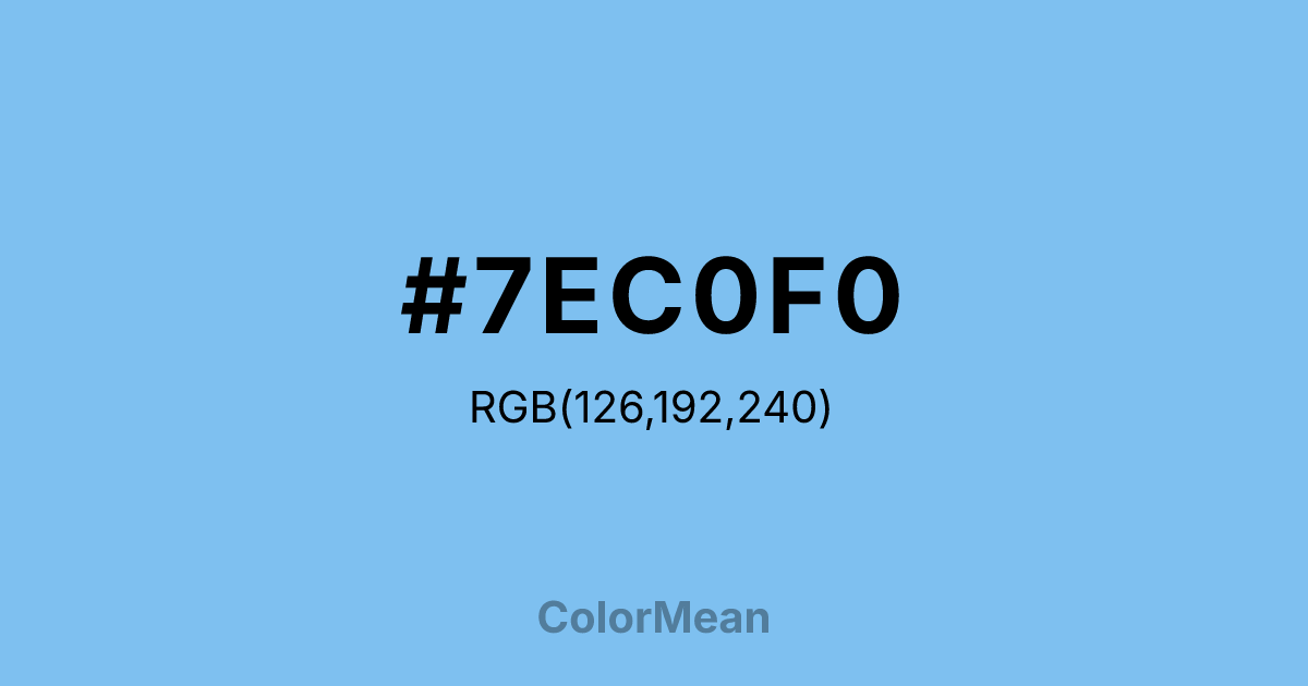 #7EC0F0 RGB value is (126, 192, 240). The hex color red value is 126, green is 192, and blue is 240. Its HSL format shows a hue of 205°, saturation of 79 percent, and lightness of 72 percent. The CMYK process values are 48 percent, 20 percent, 0 percent, 6 percent.