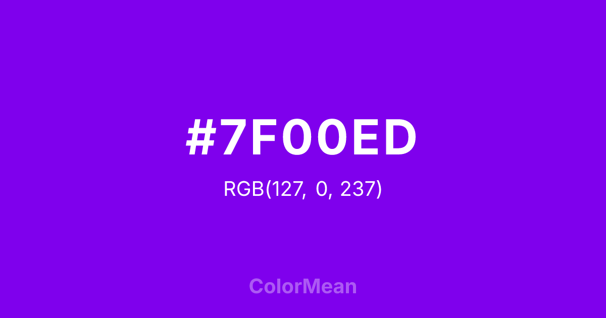 #7F00ED RGB value is (127, 0, 237). The hex color red value is 127, green is 0, and blue is 237. Its HSL format shows a hue of 272°, saturation of 100 percent, and lightness of 46 percent. The CMYK process values are 46 percent, 100 percent, 0 percent, 7 percent.