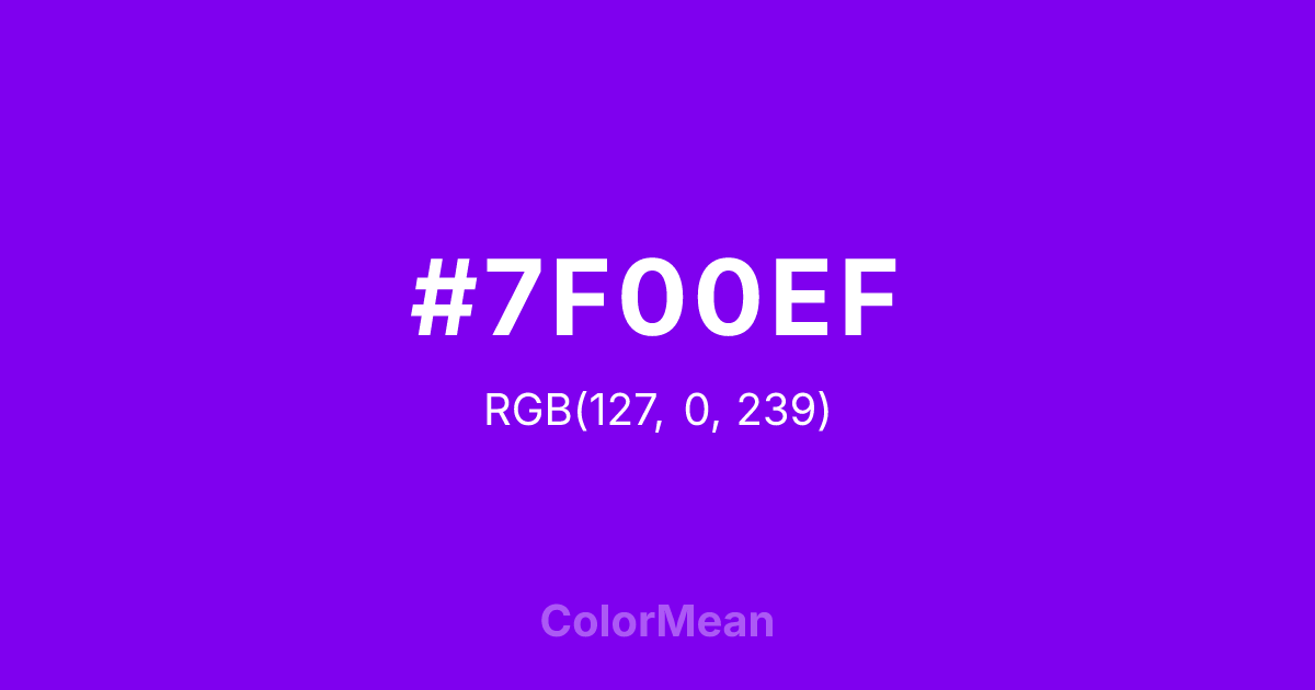 #7F00EF RGB value is (127, 0, 239). The hex color red value is 127, green is 0, and blue is 239. Its HSL format shows a hue of 272°, saturation of 100 percent, and lightness of 47 percent. The CMYK process values are 47 percent, 100 percent, 0 percent, 6 percent.