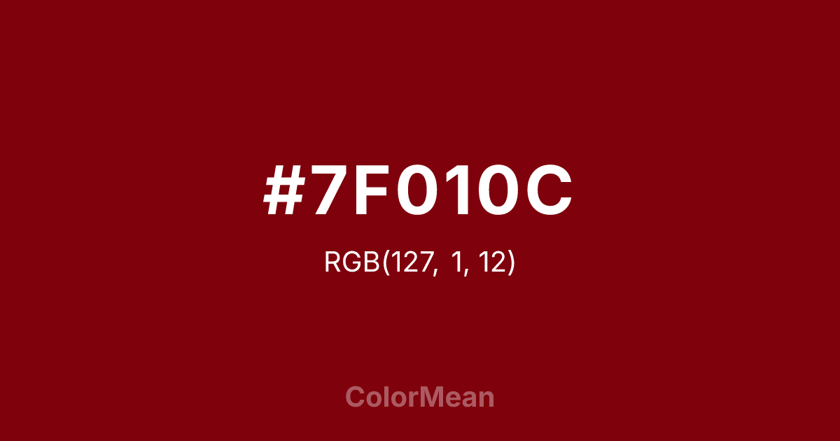#7F010C RGB value is (127, 1, 12). The hex color red value is 127, green is 1, and blue is 12. Its HSL format shows a hue of 355°, saturation of 98 percent, and lightness of 25 percent. The CMYK process values are 0 percent, 99 percent, 91 percent, 50 percent.