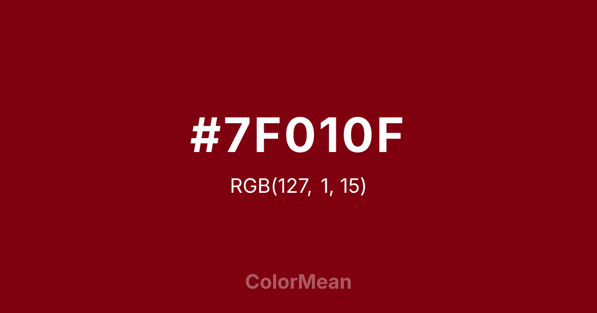 #7F010F RGB value is (127, 1, 15). The hex color red value is 127, green is 1, and blue is 15. Its HSL format shows a hue of 353°, saturation of 98 percent, and lightness of 25 percent. The CMYK process values are 0 percent, 99 percent, 88 percent, 50 percent.