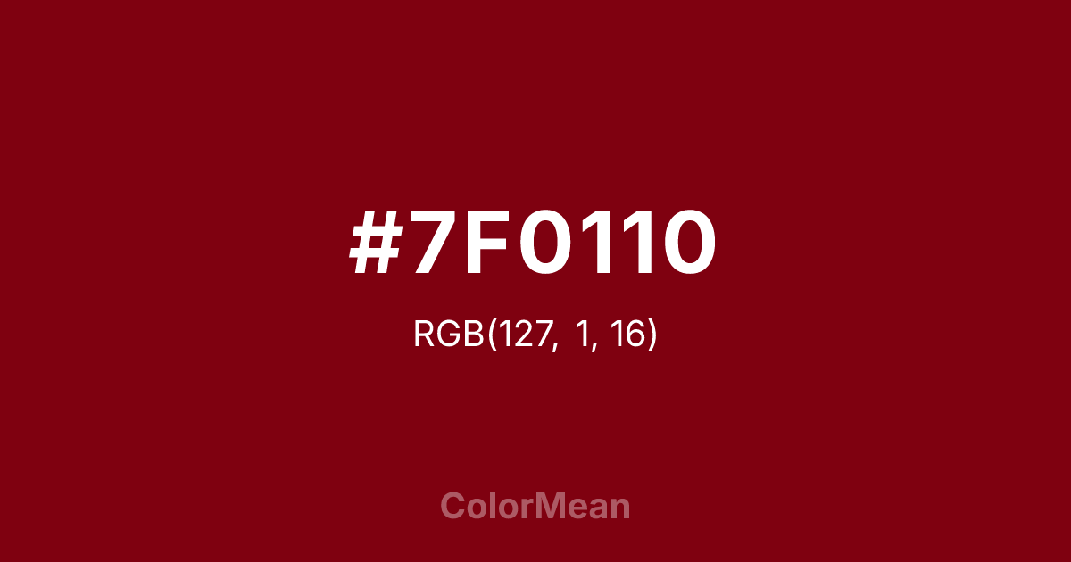 #7F0110 RGB value is (127, 1, 16). The hex color red value is 127, green is 1, and blue is 16. Its HSL format shows a hue of 353°, saturation of 98 percent, and lightness of 25 percent. The CMYK process values are 0 percent, 99 percent, 87 percent, 50 percent.