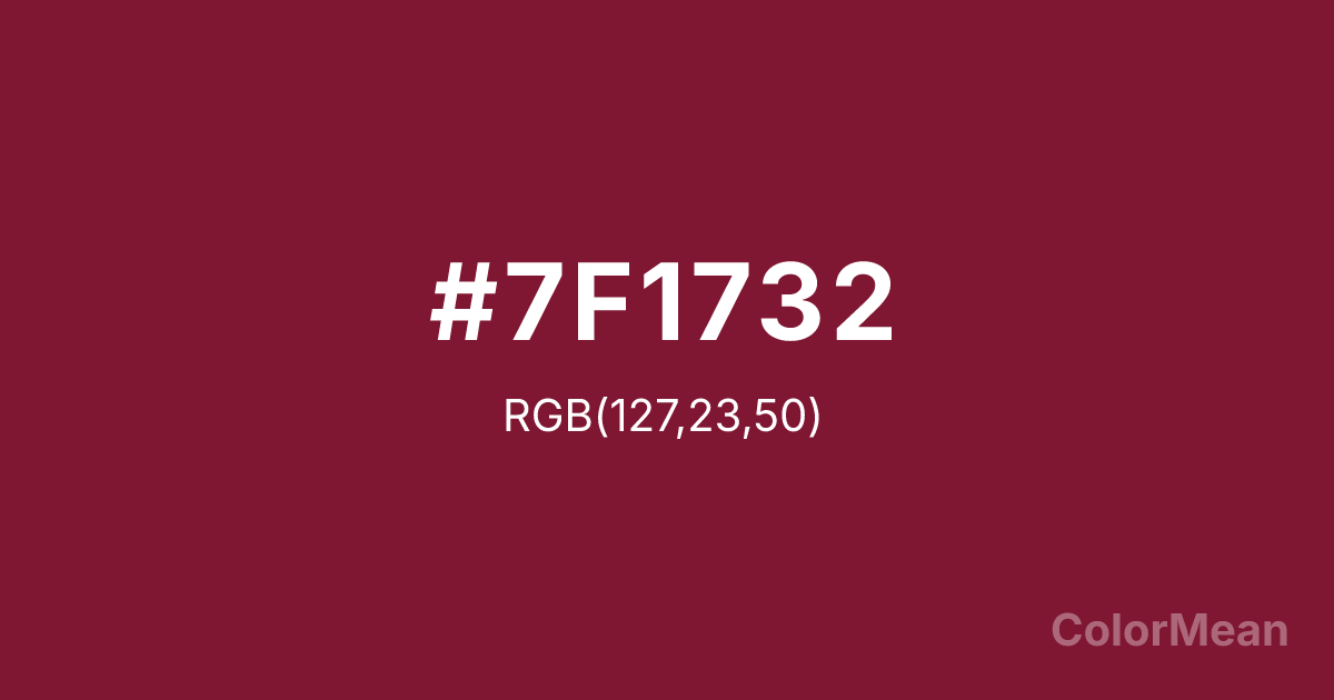 #7F1732 RGB value is (127, 23, 50). The hex color red value is 127, green is 23, and blue is 50. Its HSL format shows a hue of 344°, saturation of 69 percent, and lightness of 29 percent. The CMYK process values are 0 percent, 82 percent, 61 percent, 50 percent.