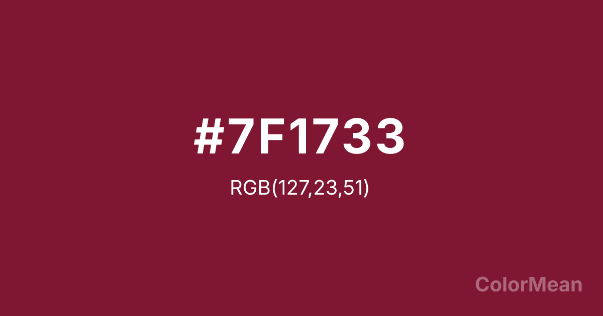 #7F1733 RGB value is (127, 23, 51). The hex color red value is 127, green is 23, and blue is 51. Its HSL format shows a hue of 344°, saturation of 69 percent, and lightness of 29 percent. The CMYK process values are 0 percent, 82 percent, 60 percent, 50 percent.