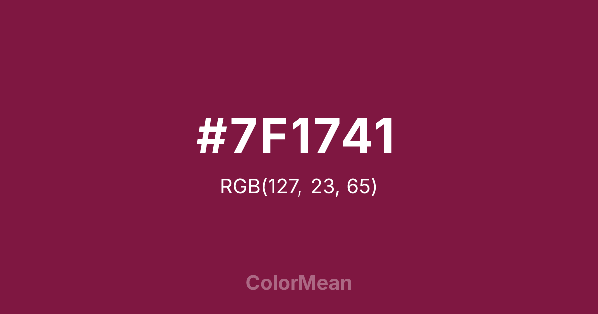 #7F1741 RGB value is (127, 23, 65). The hex color red value is 127, green is 23, and blue is 65. Its HSL format shows a hue of 336°, saturation of 69 percent, and lightness of 29 percent. The CMYK process values are 0 percent, 82 percent, 49 percent, 50 percent.