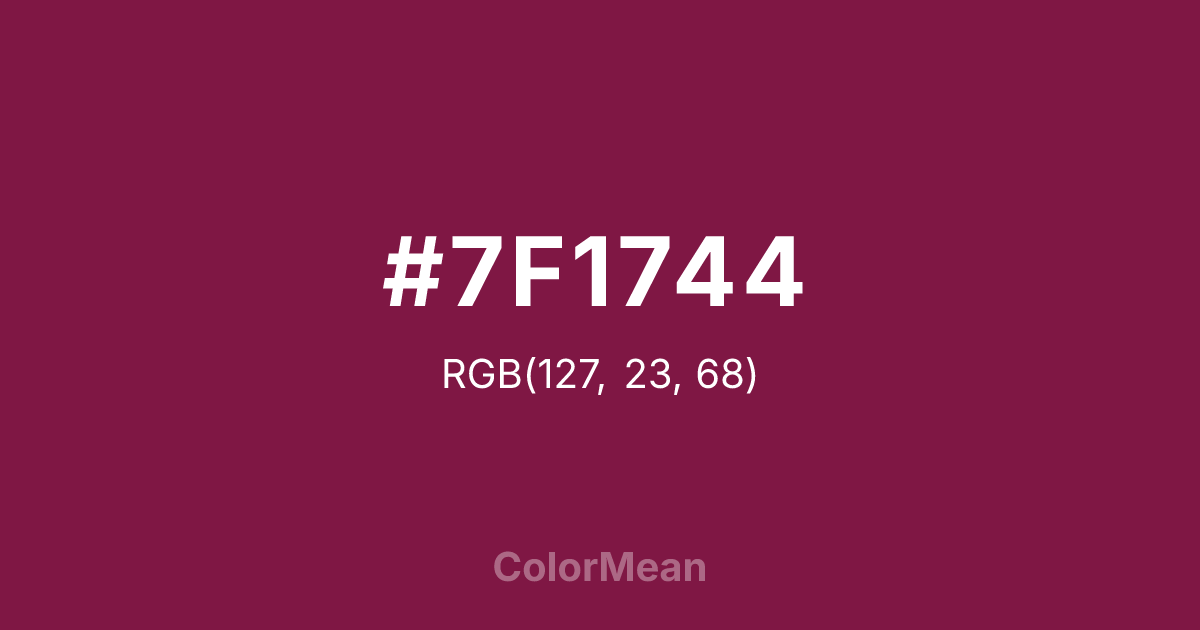 #7F1744 RGB value is (127, 23, 68). The hex color red value is 127, green is 23, and blue is 68. Its HSL format shows a hue of 334°, saturation of 69 percent, and lightness of 29 percent. The CMYK process values are 0 percent, 82 percent, 46 percent, 50 percent.