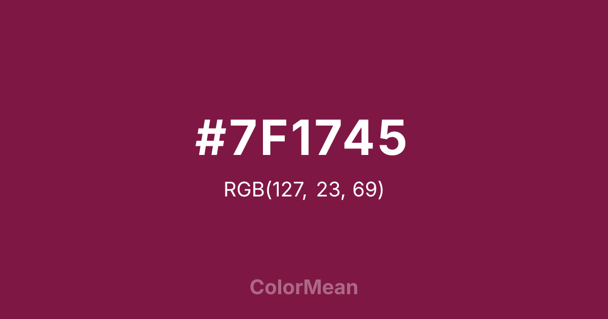 #7F1745 RGB value is (127, 23, 69). The hex color red value is 127, green is 23, and blue is 69. Its HSL format shows a hue of 333°, saturation of 69 percent, and lightness of 29 percent. The CMYK process values are 0 percent, 82 percent, 46 percent, 50 percent.