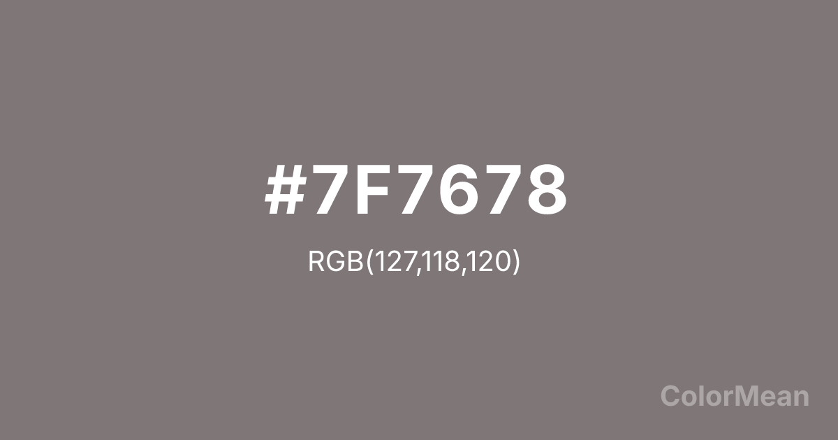 #7F7678 RGB value is (127, 118, 120). The hex color red value is 127, green is 118, and blue is 120. Its HSL format shows a hue of 347°, saturation of 4 percent, and lightness of 48 percent. The CMYK process values are 0 percent, 7 percent, 6 percent, 50 percent.