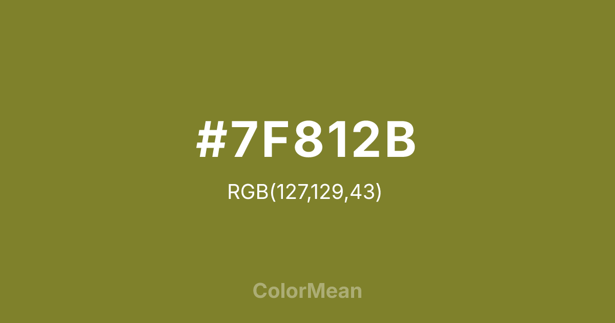 #7F812B RGB value is (127, 129, 43). The hex color red value is 127, green is 129, and blue is 43. Its HSL format shows a hue of 61°, saturation of 50 percent, and lightness of 34 percent. The CMYK process values are 2 percent, 0 percent, 67 percent, 49 percent.