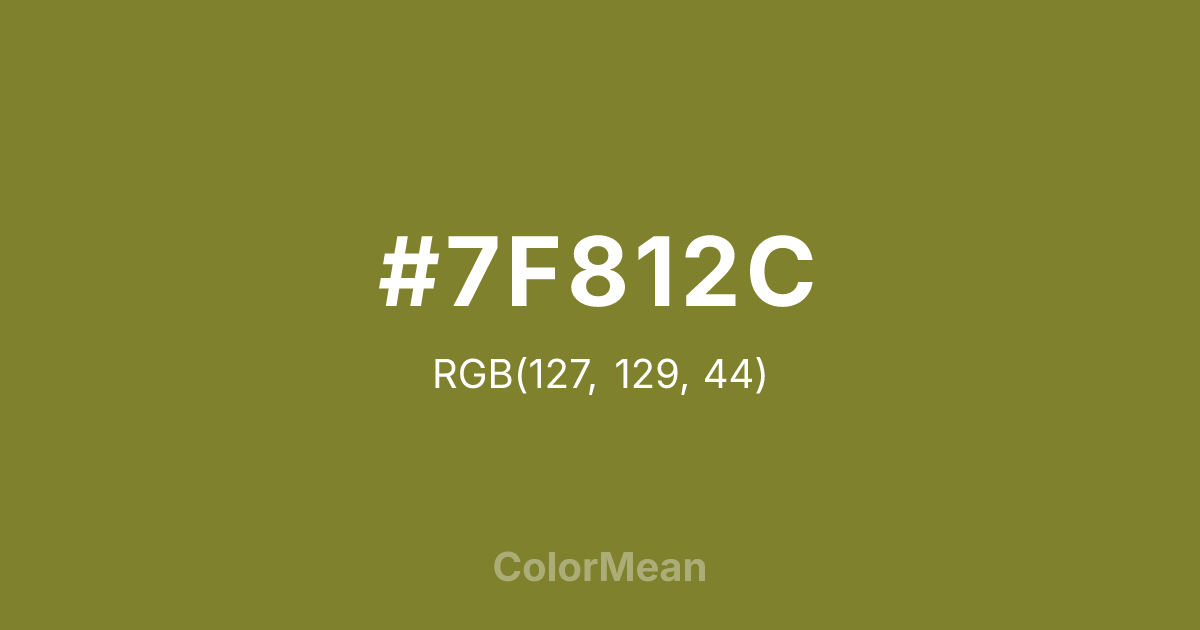 #7F812C RGB value is (127, 129, 44). The hex color red value is 127, green is 129, and blue is 44. Its HSL format shows a hue of 61°, saturation of 49 percent, and lightness of 34 percent. The CMYK process values are 2 percent, 0 percent, 66 percent, 49 percent.