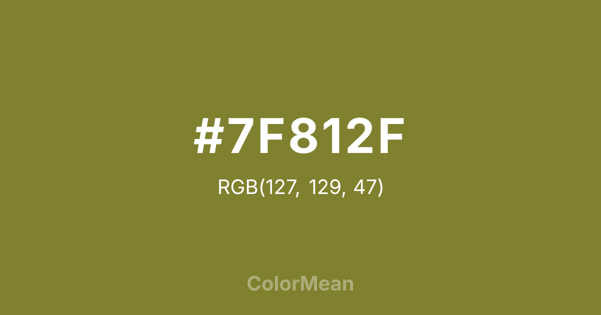 #7F812F RGB value is (127, 129, 47). The hex color red value is 127, green is 129, and blue is 47. Its HSL format shows a hue of 61°, saturation of 47 percent, and lightness of 35 percent. The CMYK process values are 2 percent, 0 percent, 64 percent, 49 percent.