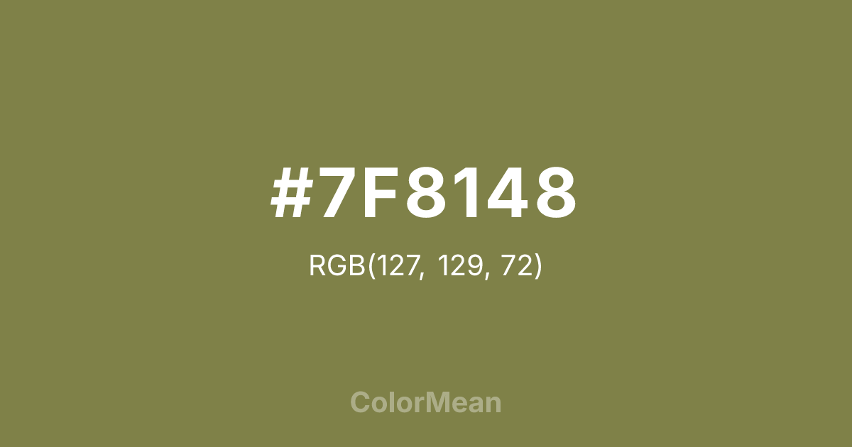 #7F8148 RGB value is (127, 129, 72). The hex color red value is 127, green is 129, and blue is 72. Its HSL format shows a hue of 62°, saturation of 28 percent, and lightness of 39 percent. The CMYK process values are 2 percent, 0 percent, 44 percent, 49 percent.