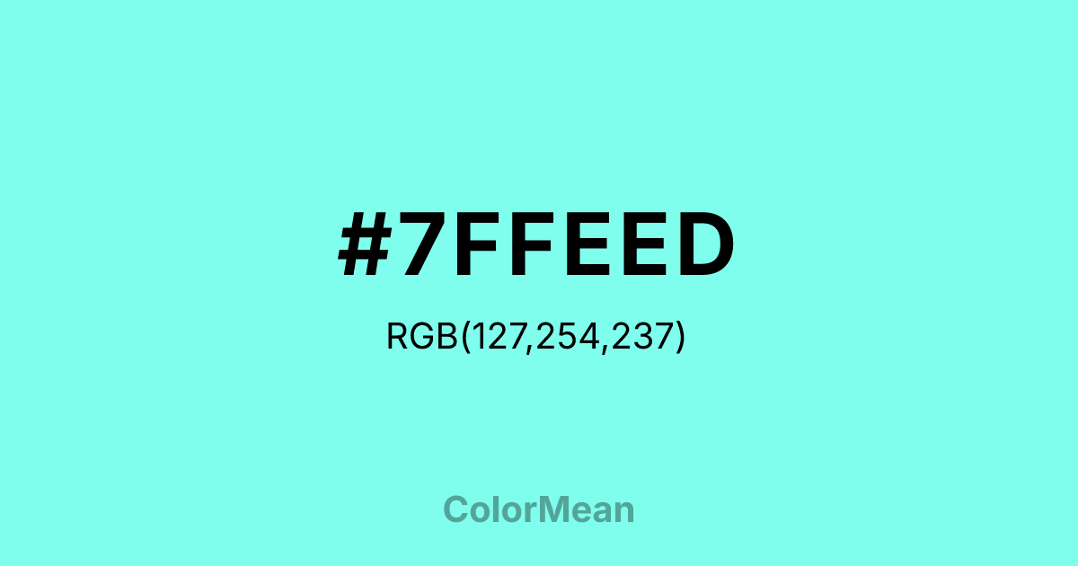 #7FFEED RGB value is (127, 254, 237). The hex color red value is 127, green is 254, and blue is 237. Its HSL format shows a hue of 172°, saturation of 98 percent, and lightness of 75 percent. The CMYK process values are 50 percent, 0 percent, 7 percent, 0 percent.