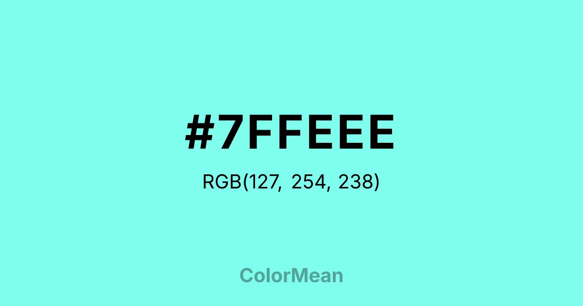 #7FFEEE RGB value is (127, 254, 238). The hex color red value is 127, green is 254, and blue is 238. Its HSL format shows a hue of 172°, saturation of 98 percent, and lightness of 75 percent. The CMYK process values are 50 percent, 0 percent, 6 percent, 0 percent.